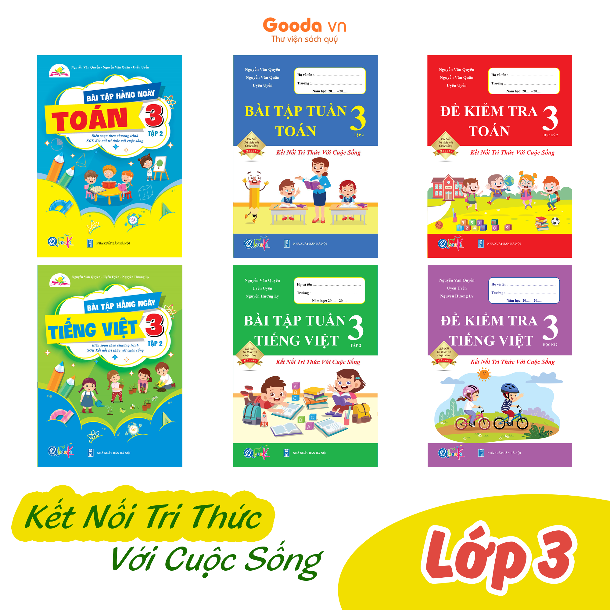 Bộ sách Lớp 3 Kết nối tri thức - Kì 2 đầy đủ gồm có 6 cuốn (2 môn Toán và tiếng Việt, mỗi môn có 1 cuốn bài tập hằng ngày, tuần và đề kiêm tra)