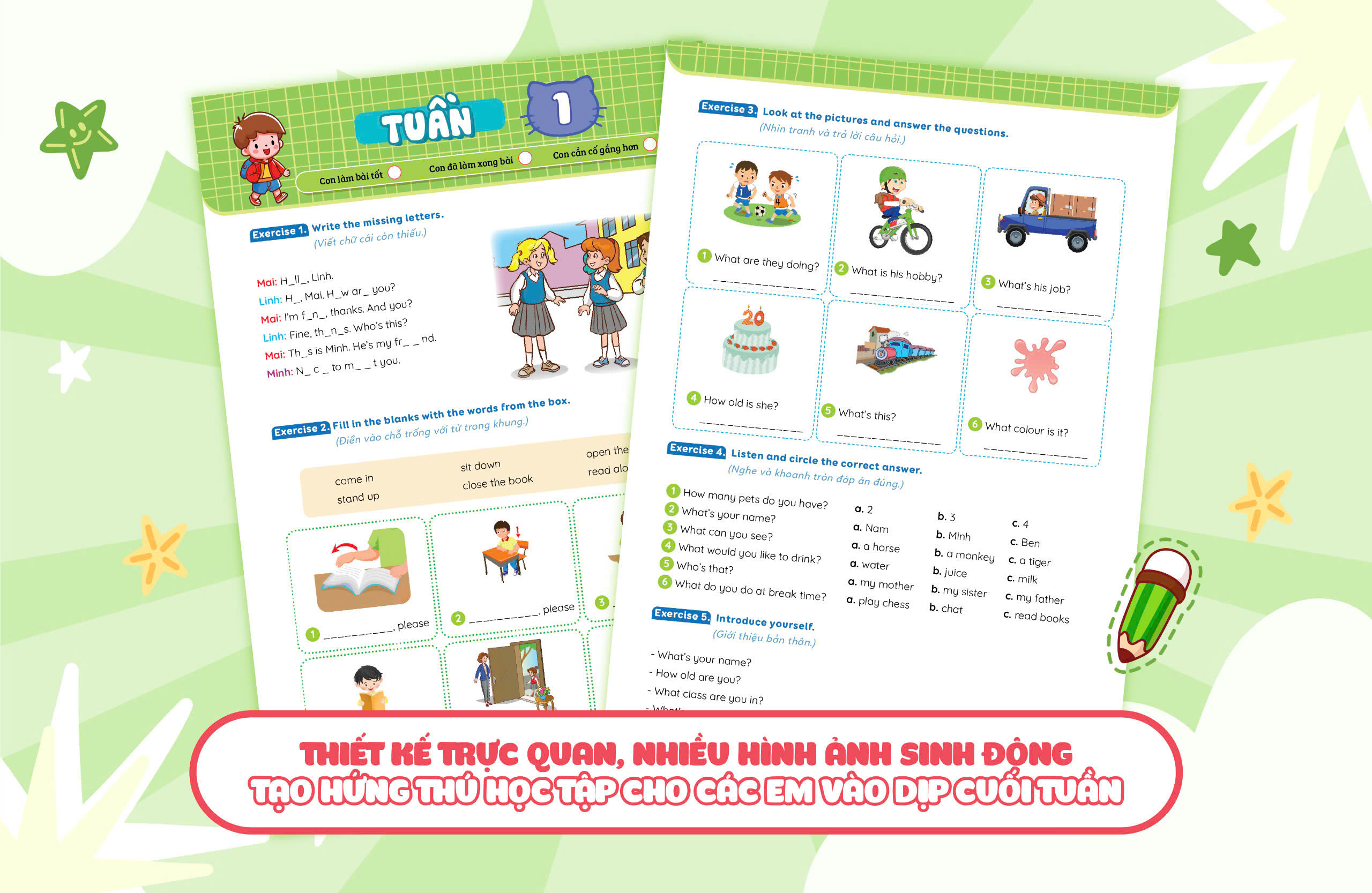 Sách được thiết kế với bố cục dễ hiểu với nhiều hình ảnh và được in màu sinh động giúp các con hứng thú với việc học vào những ngày cuối tuần.