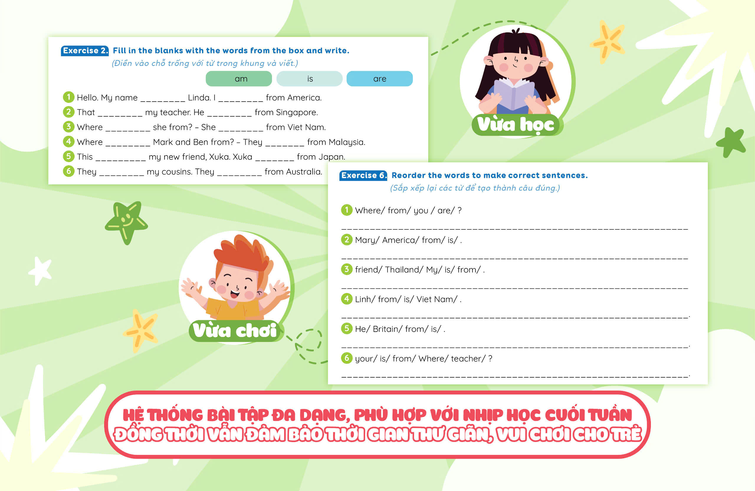Hệ thống bài tập đa dạng, lượng phù hợp với việc học cuối tuần để các con vẫn có thời gian thư giãn và vui chơi.
