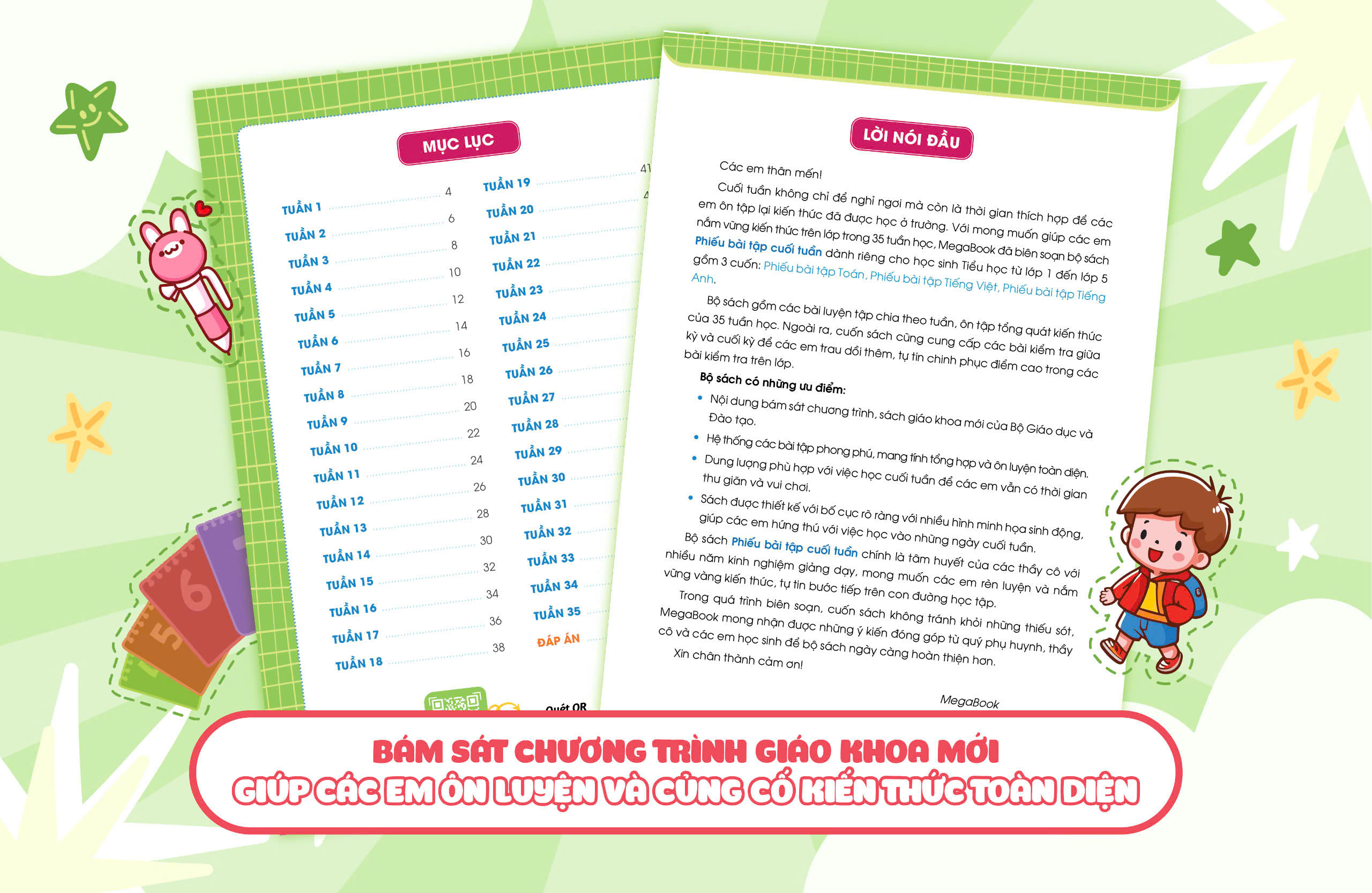 Cuối tuần không chỉ để nghỉ ngơi mà còn là thời gian thích hợp để các con ôn tập lại kiến thức đã được học ở trường. Với mong muốn giúp các con nắm vững kiến thức trên lớp trong 35 tuần học, MegaBook đã biên soạn bộ sách Phiếu bài tập cuối tuần dành riêng cho học sinh tiểu học từ lớp 1 đến lớp 5 với bộ 3 cuốn: Phiếu bài tập Toán, Phiếu bài tập Tiếng Việt, Phiếu bài tập Tiếng Anh.