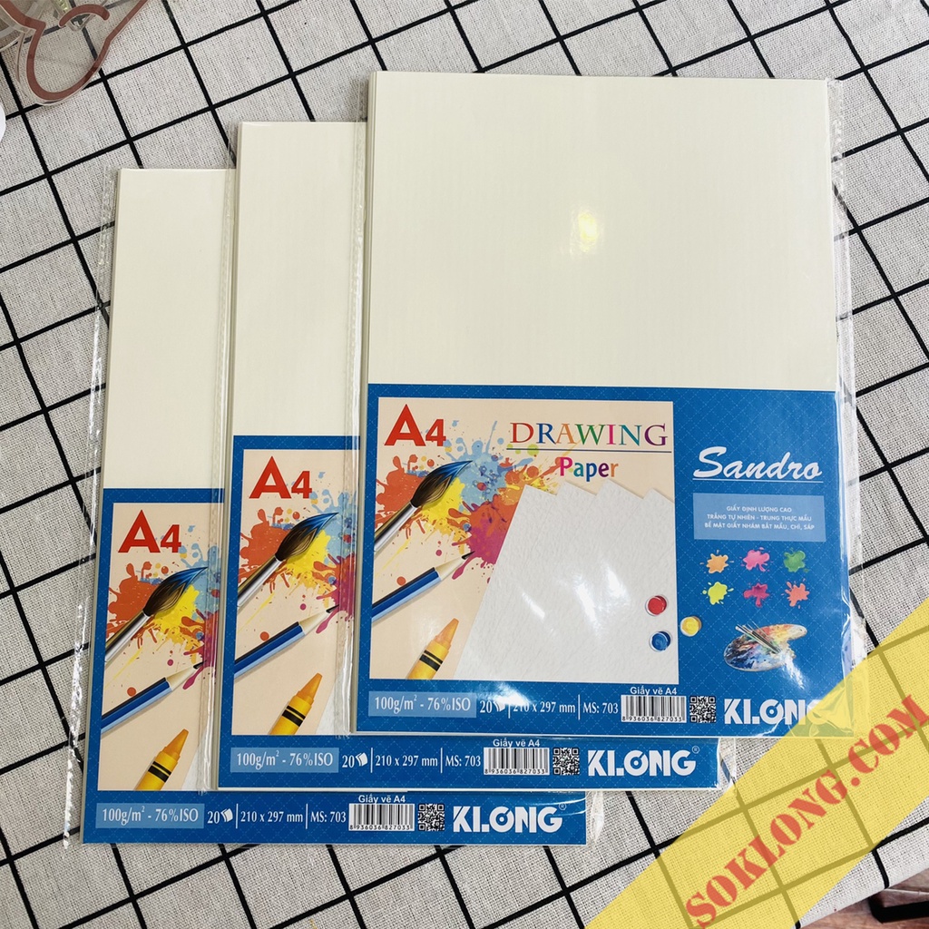 Giới thiệu Giấy vẽ A4 Klong tập 20 tờ giấy vẽ màu chì than, bút sáp, màu nước 100gsm MS 703