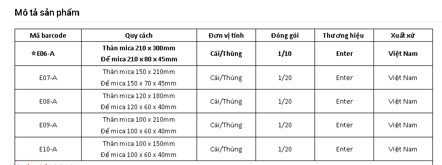 Kệ mica 2 mặt Enter để bàn là sản phẩm làm từ Mica Đài Loan, có công dụng trưng bày thực đơn, hiển thị giá cả sản phẩm tại các nhà hàng, khách sạn... sản phẩm này còn được dùng như một standee để bàn quảng cáo sản phẩm một cách ấn tượng nhất.