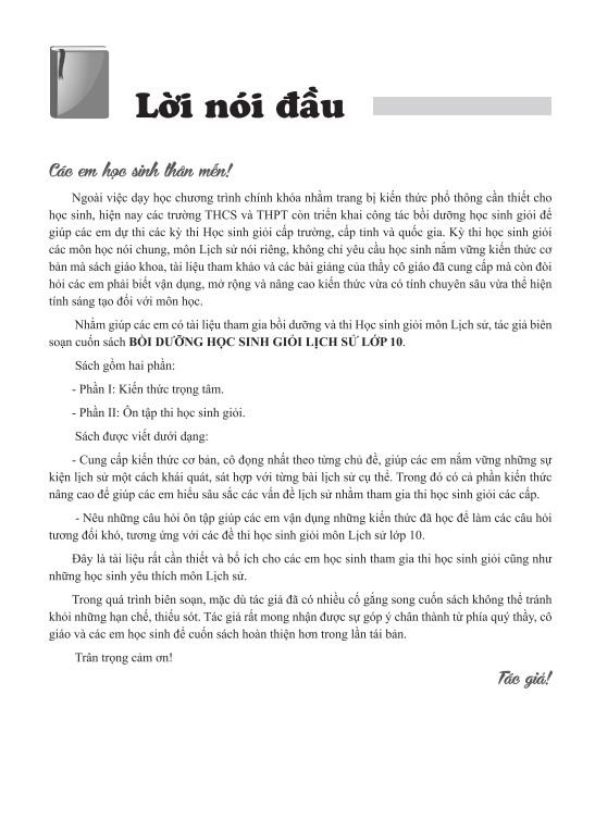Hy vọng rằng, cuốn sách này là tài liệu hữu ích đối với các thầy giáo, cô giáo dạy môn Lịch sử và các em học sinh lớp 10, đồng thời là tài liệu chung cho bạn đọc quan tâm tìm hiểu Lịch sử.