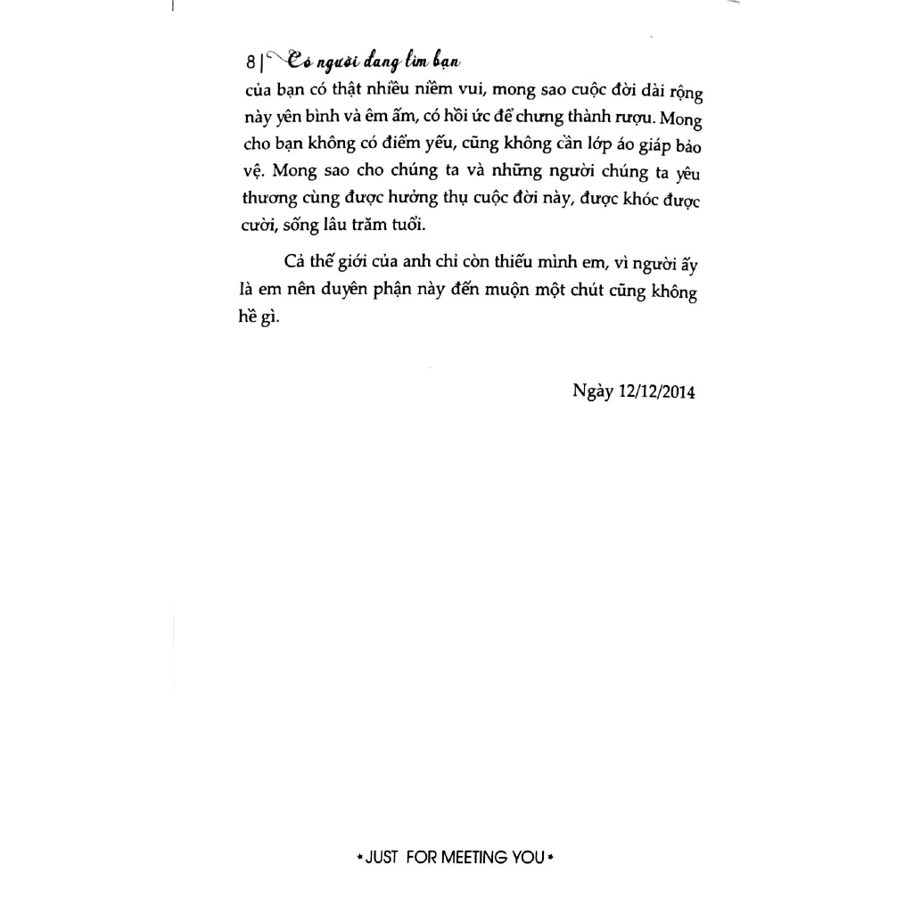 Có Người Đang Tìm Bạn Cuốn sách này giống như một chiếc Ô ngoài cửa khách sạn, gặp ngày trời mưa sẽ nhắc bạn đừng để bị ướt. Nó cũng giống như một cái BẠT TAI ĐAU ĐỚN để nhẫn tâm thức tỉnh mỗi khi bạn sung sướng đắm chìm trong hạnh phúc đến nỗi quên cả HÌNH TƯỢNG của mình. Nó còn giống như một tiếng HÉT lớn khi bạn đang CHÌM NGHỈM giữa dòng người cô đơn, nghe thấy nó, bạn chắc chắn sẽ quay đầu. Ừm, có người đang tìm bạn đấy mà. "Có người đang tìm bạn" là tác phẩm của tác giả trẻ Trương Hạo Thần, tiếp nối thành công của "Cảm ơn tôi đã đủ dũng cảm" trước đó. Nếu như "Cảm ơn tôi đã đủ dũng cảm" là những mẩu truyện mà tác giả viết về những người xung quanh, gồm cả gia đình, bạn bè... thì "Có người đang tìm bạn" lại là những truyện ngắn được sáng tạo cốt truyện và xây dựng nhân vật một cách đáng yêu và gần gụi. "Mười hai truyện ngắn với vô số những câu chuyện tình cảm khác nhau. Bạn có thể chọn đọc vào đêm khuya trước khi đi ngủ hoặc trên chuyến tàu điện những lúc vội tới công sở, tùy bạn lựa chọn. Hãy cảm nhận những yêu hận của họ, dù hạnh phúc hay bi thương, dù điên cuồng hay tiếc nuối. Khi bạn đơn độc, yêu đơn phương hay bị từ chối, thậm chí là lúc phải cố gắng để từ bỏ tất cả, nó sẽ là một chiếc ôm vượt mọi khoảng cách không gian, mang tới cho bạn những bình yên lặng lẽ. ... Mong sao sự xuất hiện của một người nào đó có thể khiến thế giới của bạn trở nên phong phú, mong cuộc sống của bạn có thật nhiều niềm vui, mong sao cuộc đời dài rộng này yên bình và êm ấm, có hồi ức để chưng thành rượu. Mong cho bạn không có điểm yếu, cũng không cần lớp áo giáp bảo vệ. Mong sao cho chúng ta và những người chúng ta yêu thương cùng được hưởng thụ cuộc sống này, được khóc được cười, sống lâu trăm tuổi." - Trương Hạo Thần -