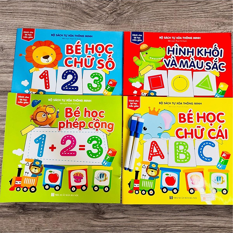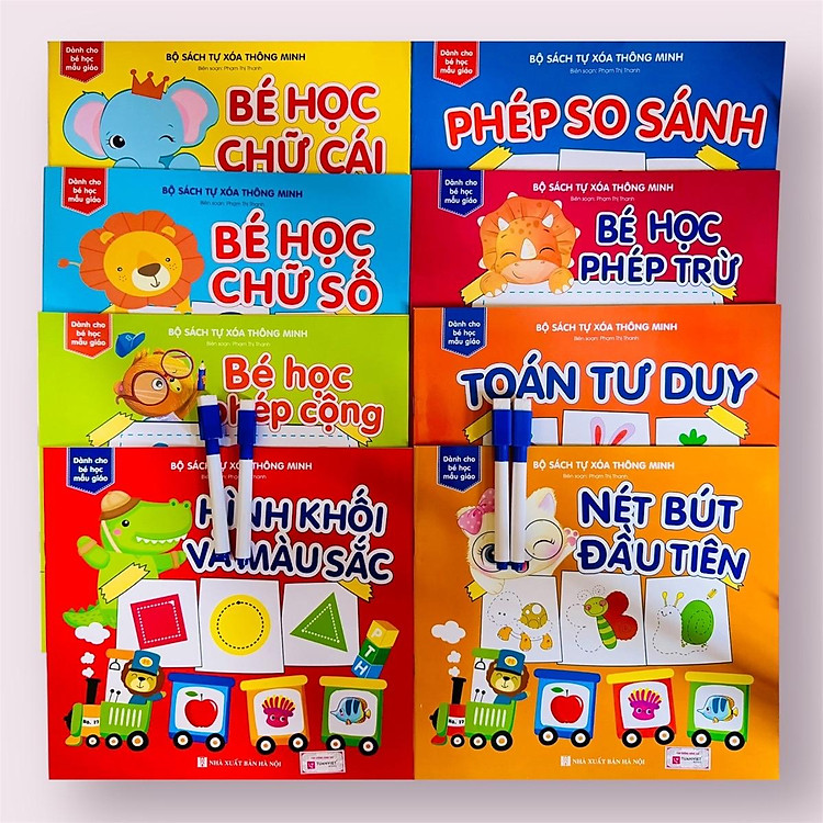 - Tên sách: 8 cuốn Sách tự xóa: Chữ cái - Toán - Chữ số - Hình khối & Màu sắc ; Phép trừ + Phép so sánh + Toán tư duy + Nét bút(tặng kèm bút)