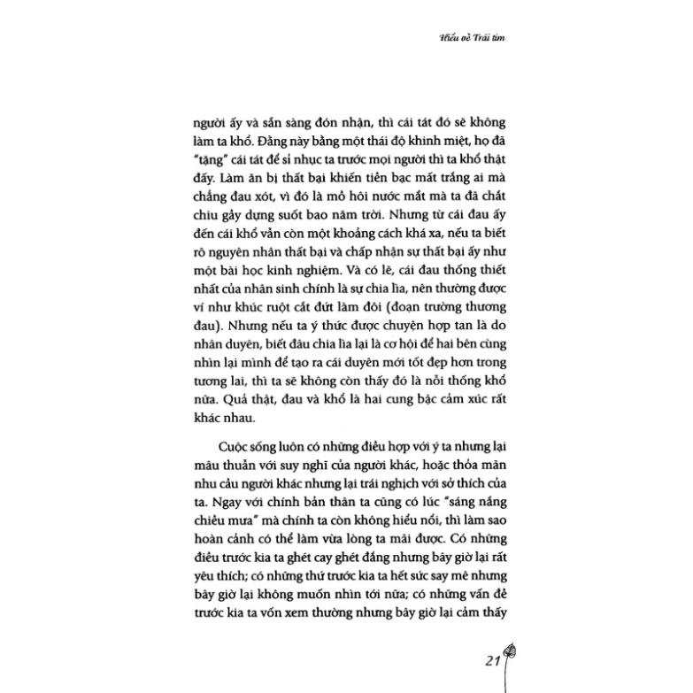 “Để chữa lành những tổn thương và nổi đau, cách tốt nhứt và hữu hiệu nhất là cần hiểu rõ được trái tim, tâm hồn của mình, và của người khác, cuốn sách Hiểu về Trái Tim chính là cuốn sách giúp bạn đọc làm được điều đó: Hiểu rõ và chữa lành trái tim, tâm hồn của mình và của những người xung quanh, để mọi người cùng được sống trong hạnh phúc và yêu thương.