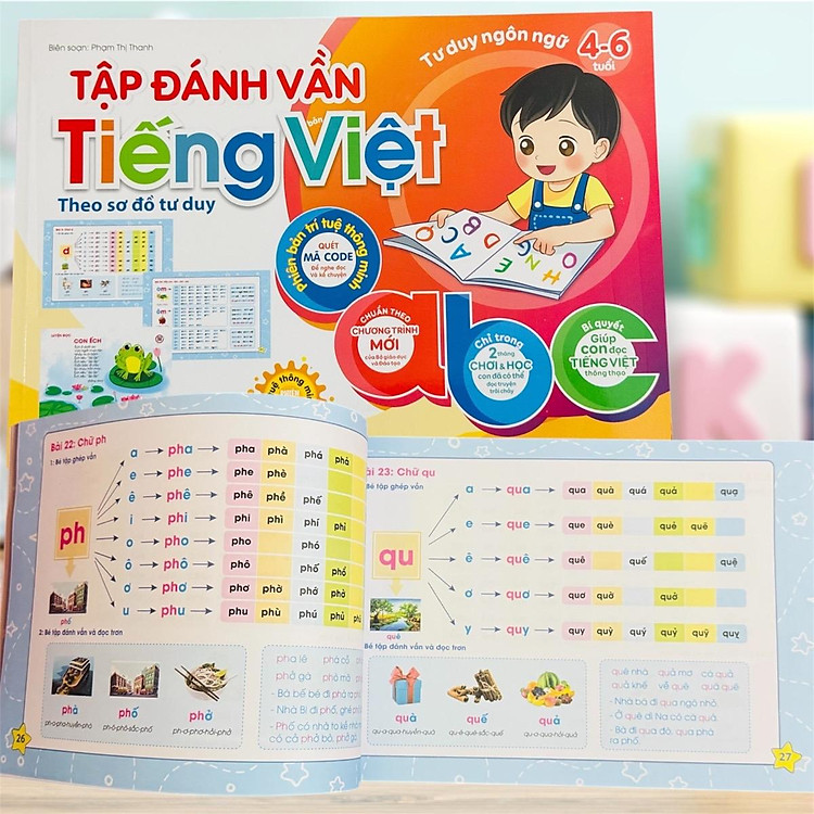 Đánh vần tiếng Việt với 124 trang cùng đầy đủ nội dung chữ cái cùng bộ học vần theo chương trình mới nhất bài học giới thiệu bảng chữ cái Tiếng Việt, dấu thanh và vần Tiếng Việt giúp các bé bước đầu làm quen với chữ viết và cách đánh vần Tiếng Việt. Mỗi bài học gồm các từ vựng, câu, đa dạng, bé tha hồ tập đánh vần, tập đọc mà không bị nhàm chán. Đặc biệt, các chữ in mầu, vẽ sơ đồ cầu trúc từ đơn giản đến phức tạp cực kỳ đễ hiểu và logic cùng màu sắc tươi tắn khiến cho việc học trở nên thú vị hơn.