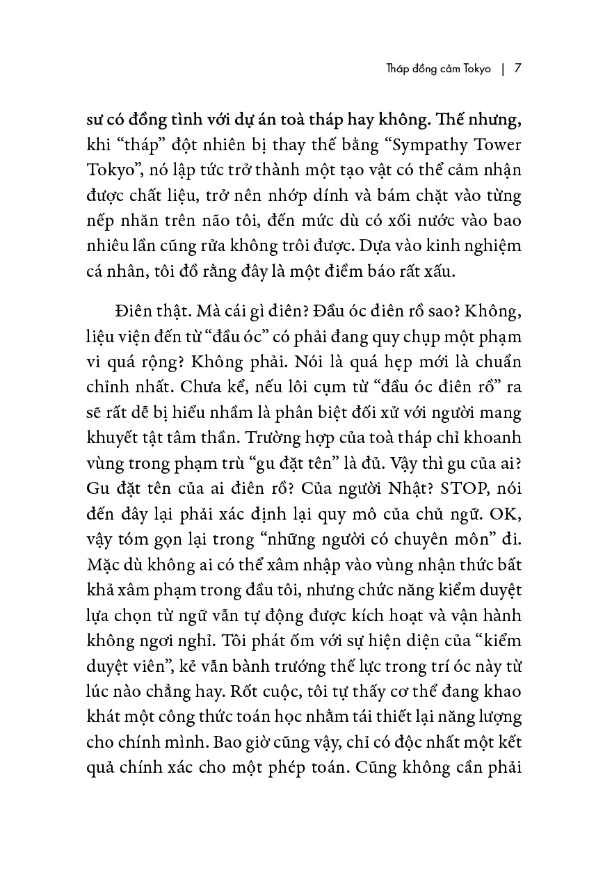 Với văn phong dữ dội mà sắc lạnh, tiểu thuyết này bóc trần mối quan hệ giữa những mĩ từ sáo rỗng và thứ công lí vô thực như một lời tiên tri đến từ thời đại của trí tuệ nhân tạo. Đan cài các chủ đề về kiến trúc, ngôn ngữ, AI, kí ức cá nhân, bản chất của lòng trắc ẩn và quyền năng của trí tưởng tượng, Tháp đồng cảm Tokyo không chỉ chất vấn xã hội Nhật Bản đương đại mà còn khiến người đọc thảng thốt khi nhận ra thế giới quanh mình – và chính bản thân mình – hiện ra rõ ràng đến thế trong gương soi văn chương.