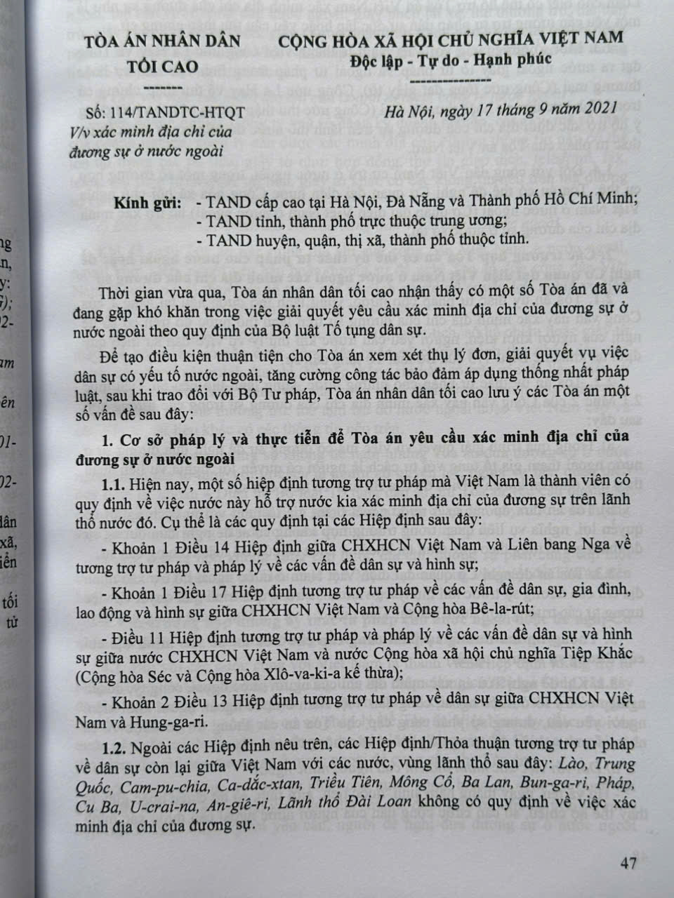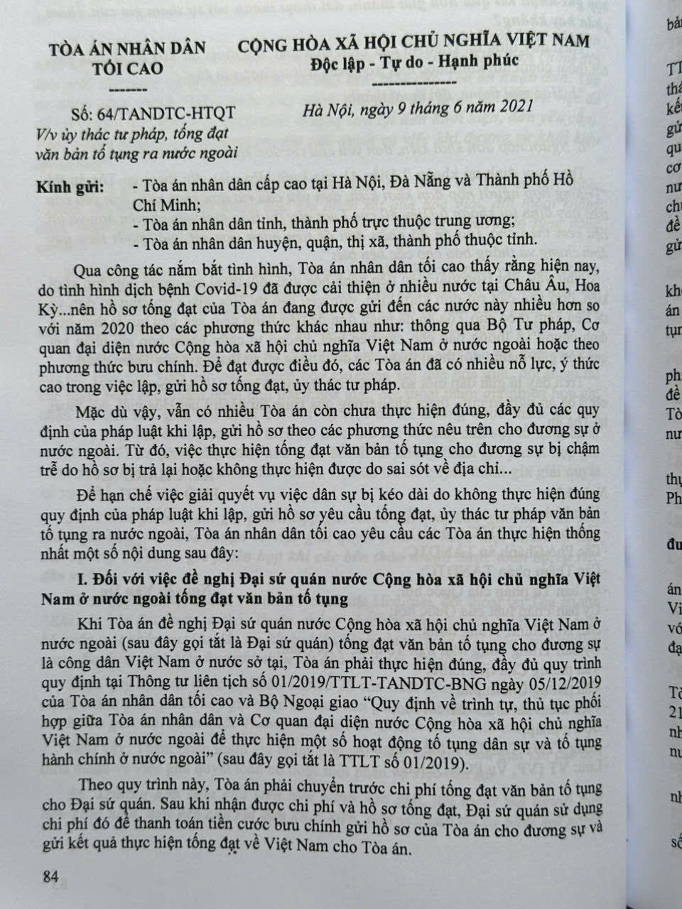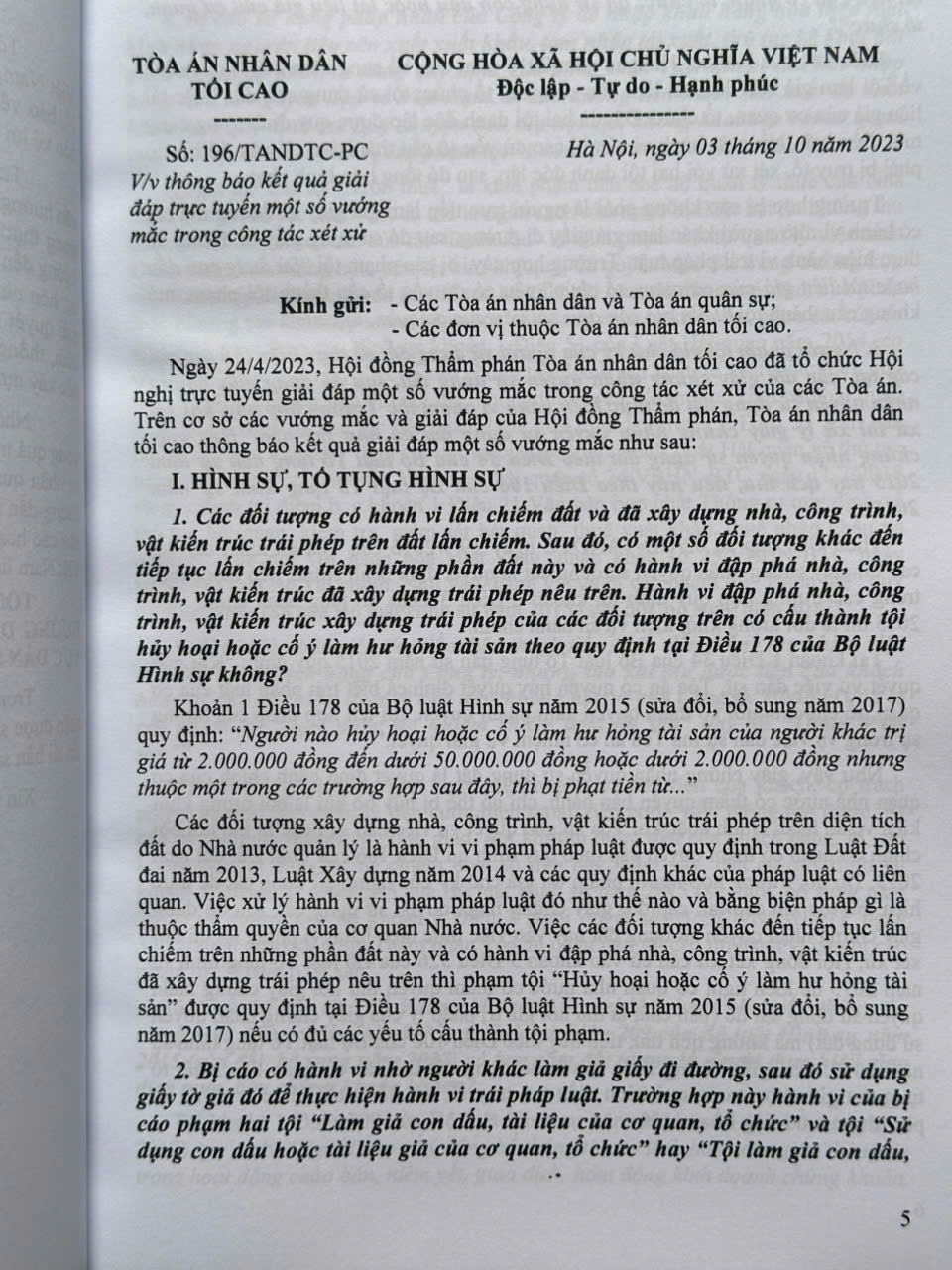 Từ năm 1986 đến nay, Tòa án nhân dân tối cao đã ban hành nhiều Công văn hướng dẫn nghiệp vụ làm cơ sở giải quyết những hạn chế tồn tại, vướng mắc trong thực tiễn áp dụng pháp luật. Các công văn của Tòa án nhân dân tối cao hướng đến làm rõ các quy định của pháp luật trong xét xử các vụ án hình sự, dân sự, hôn nhân và gia đình, kinh doanh, thương mại, lao động, hành chính,… và giải quyết các việc khác theo quy định của pháp luật, góp phần bảo đảm sự ổn định, thống nhất của pháp luật, bảo đảm bình đẳng, công bằng, công lý vì mục tiêu xây dựng nhà nước pháp quyền xã hội chủ nghĩa.