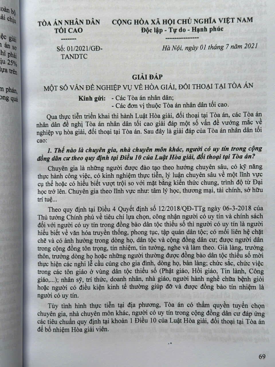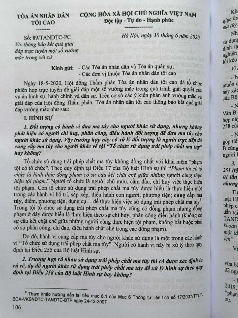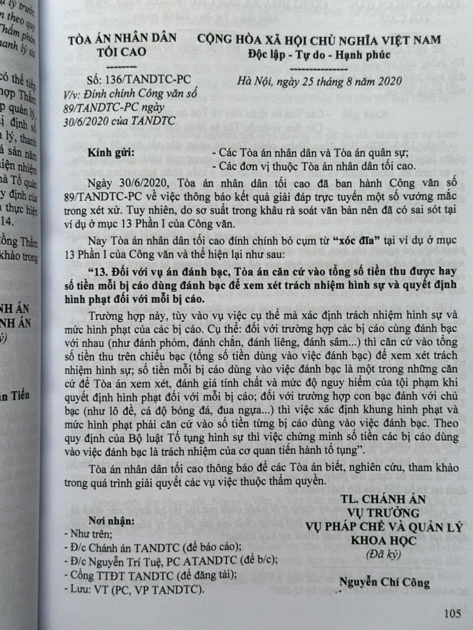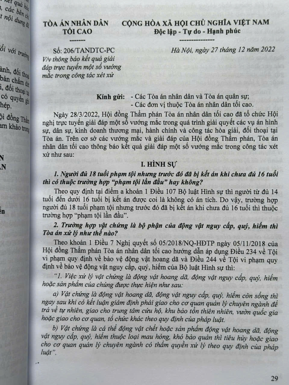 Từ năm 1986 đến nay, Tòa án nhân dân tối cao đã ban hành nhiều Công văn hướng dẫn nghiệp vụ làm cơ sở giải quyết những hạn chế tồn tại, vướng mắc trong thực tiễn áp dụng pháp luật. Các công văn của Tòa án nhân dân tối cao hướng đến làm rõ các quy định của pháp luật trong xét xử các vụ án hình sự, dân sự, hôn nhân và gia đình, kinh doanh, thương mại, lao động, hành chính,… và giải quyết các việc khác theo quy định của pháp luật, góp phần bảo đảm sự ổn định, thống nhất của pháp luật, bảo đảm bình đẳng, công bằng, công lý vì mục tiêu xây dựng nhà nước pháp quyền xã hội chủ nghĩa.