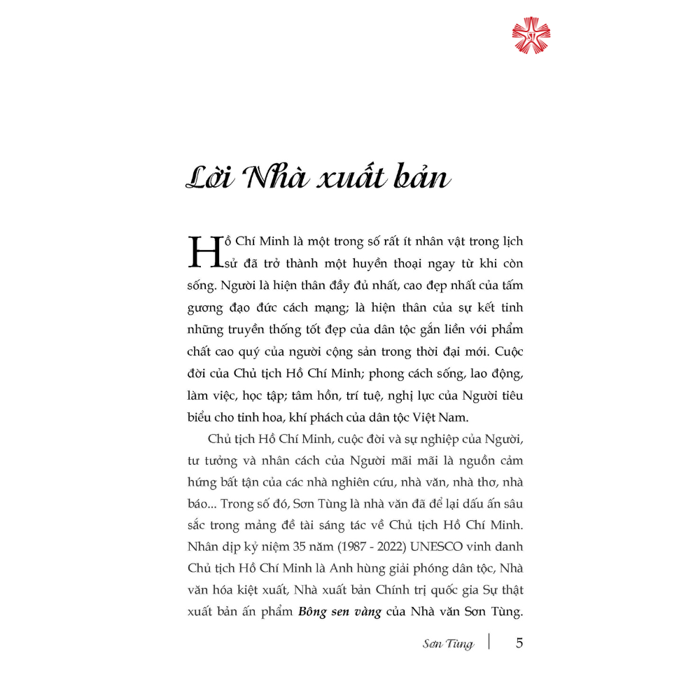 Chủ tịch Hồ Chí Minh, cuộc đời và sự nghiệp của Người, tư tưởng và nhân cách của Người mãi mãi là nguồn cảm hứng bất tận của các nhà nghiên cứu, nhà văn, nhà thơ, nhà báo… Trong số đó, Sơn Tùng là nhà văn đã để lại dấu ấn sâu sắc trong mảng đề tài sáng tác về Chủ tịch Hồ Chí Minh. Nhân dịp kỷ niệm 35 năm (1987 - 2022) UNESCO vinh danh Chủ tịch Hồ Chí Minh là Anh hùng giải phóng dân tộc, Nhà văn hóa kiệt xuất, Nhà xuất bản Chính trị quốc gia Sự thật xuất bản ấn phẩm BÔNG SEN VÀNG của Nhà văn Sơn Tùng. Đây là một trong số những tác phẩm nổi tiếng của ông viết về thời niên thiếu của Chủ tịch Hồ Chí Minh.