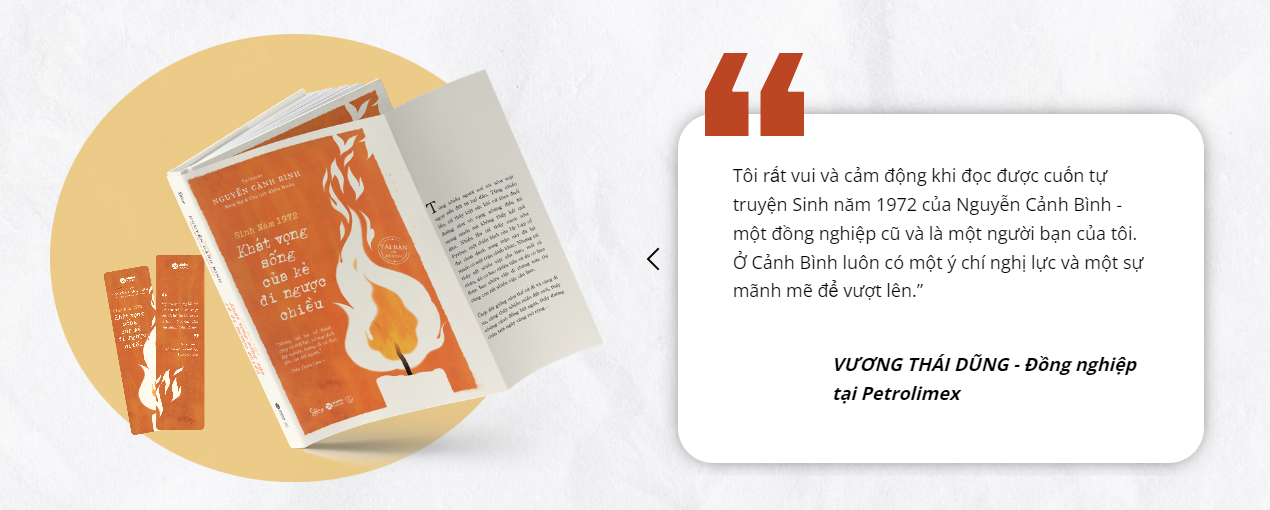 Cuốn tự truyện Sinh Năm 1972 - Khát Vọng Sống Của Kẻ Đi Ngược Chiều của Nguyễn Cảnh Bình kể về toàn bộ quá trình học tập, trưởng thành và phát triển của bản thân ông. Những thành công, thất bại trên đường đời, những mong muốn và kế hoạch tiếp theo của ông cho sự nghiệp và cuộc đời... Đặc biệt trong cuốn sách ông nhấn mạnh giai đoạn có những bước ngoặt, biến động lớn lao đối với ông. Đó là quãng những năm 1986-1992 và giai đoạn thay đổi tư duy 1996-1998, giai đoạn thành lập Alpha Books và quá trình làm sách, xuất bản, hoạt động xã hội từ 2004 đến nay của ông...   1. TUỔI THƠ, SÁCH VỞ & CÁI NGHÈO 2. NHỮNG NĂM THÁNG NGẨN NGƠ, CAY ĐẮNG VÀ U BUỒN 3. CHẶNG ĐƯỜNG ĐẾN VỚI TỰ DO 4. HÀNH TRÌNH