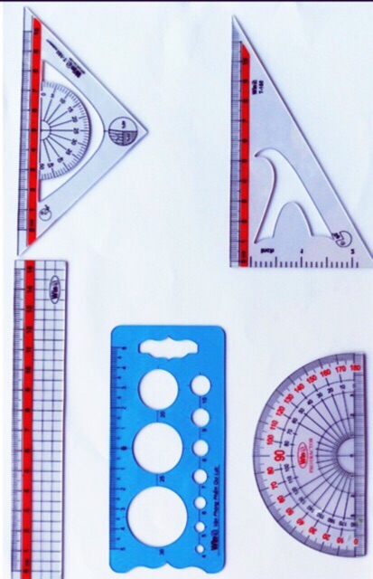 - Bộ thước nhựa trong gồm 5 loại thước: 1 thước kẻ thẳng 15cm, 1 Êke, 1 thước tam giác cân, 1 thước đo độ và 1 thước lỗ tròn.