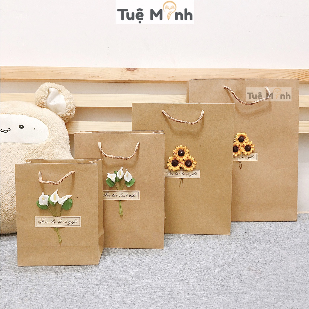 Thiết kế của túi quà kraft phù hợp với nhiều đối tượng và dịp lễ khác nhau như sinh nhật, kỷ niệm, quà cưới, 8/3, 20/11, quà tân gia... tặng bạn bè, người yêu, đối tác, khách hàng... Túi giấy đựng quà kraft mang phong cách Vintage nổi bật bởi bông hoa hướng dương/ hoa hồng môn gắn kèm bên ngoài.